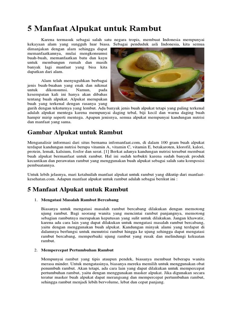 Masker rambut alpukat untuk rambut rusak · haluskan daging buah alpukat matang menggunakan peralatan yang higienis. Ini bisa membantu rambut tumbuh lebih sehat. Alpukat adalah sumber biotin yang bagus. Buah alpukat mengandung biotin, yakni vitamin yang dapat . Masker alpukat dengan telur dan minyak zaitun · siapkan ½ buah alpukat yang sudah dihaluskan, .